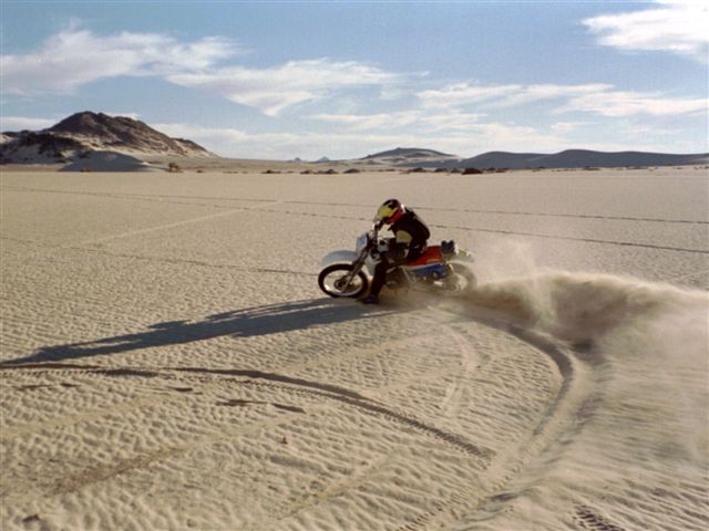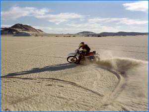 Wer kennt das Gefühl von «Tiefschneefahren» mit den Skiern? Genauso fühlt man sich beim Fahren im tiefen Sand: Man zieht seine einsamen Spuren durch die unberührte Dünenlandschaft, im Unterschied zum Skifahren nicht nur bergab, sondern auch bergauf! Ab einem bestimmten Tempo schwimmt der Stollen-bewehrte Reifen auf und lässt das Fahren mit grossen Schräglagen zu - hier im Bild: Urs versucht sich im Driften!