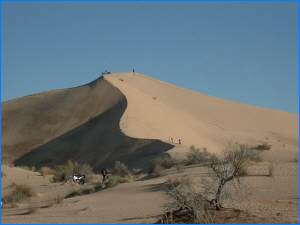 Die Wüste kann sehr unterschiedlich sein. Man kann über Dutzende an Kilometer über eine topfebene Fläche «rasen» (für uns im Gegensatz zu Rallyepiloten um die 100km/h), dann geht es durch die Steinwüste, wo man besser der Piste folgt (ab und zu sind es 10, 15 verschiedene Spuren, die nebeneinander liegen) bei Geschwindigkeiten zwischen 20 und 50 km/h, je nach Kurvenradien. Dazwischen fährt man in Tälern zwischen felsigen Gebirgen oder zwischen Dünenkämmen: Diese wiederum laden ein, sich an ihren Flanken zu tummeln oder gar ihre Spitzen zu erklimmen! |