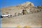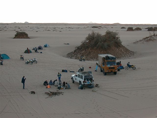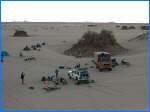 Nachtlager mitten in der Wüste: Wenn man (und das muss rechtzeitig geschehen, da die Nacht innerhalb einer Viertelstunde hereinbricht) gedenkt, ein Lager zu errichten, so verlässt man die Piste und sucht sich einen verborgenen Winkel ohne direkten Sichtkontakt. Auch wenn nur ganz wenige Personen unterwegs sind, so weiss man nie, mit wem es zu tun hat. So hat unser Führer erzählt, dass er einmal mit einer Gruppe eine Schmugglerbande im Konvoi getroffen hat und nur dank dem, dass er sein altes Auto innerhalb dieser «Gesellschaft» wiedererkannt hat, seien sie davongekommen. Wer illegal schmuggelt ist nicht mehr weit davon, sich bei gebotener Gelegenheit «zu bedienen»: So ist die Begleitung durch einen örtlichen Führer sowas wie den Tribut, den man als Passier-Geld abliefert. Wer sich nicht daran hält, macht sich u.U. zum Opfer... |