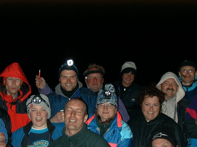 Das Bild des Jahrtausendwechsels Leider war meine damalige Digitalkamera nicht «das Gelbe vom Ei»: Ich setzte alles daran, die Sekunde zu erwischen, was mir schliesslich auch gelang. Nur war das Zoom beim automatischen Ausschalten zuvor in die Normalstellung zurückgefahren und in der Hitze des Gefechts übersah ich diesen Umstand. So war nur ein Teil der Gruppe auf dem Bild - leider! Rechts von mir meine Begleitung (damalige Ehefrau) Luzia, links mit roter Kapuze Philipp Schilde.