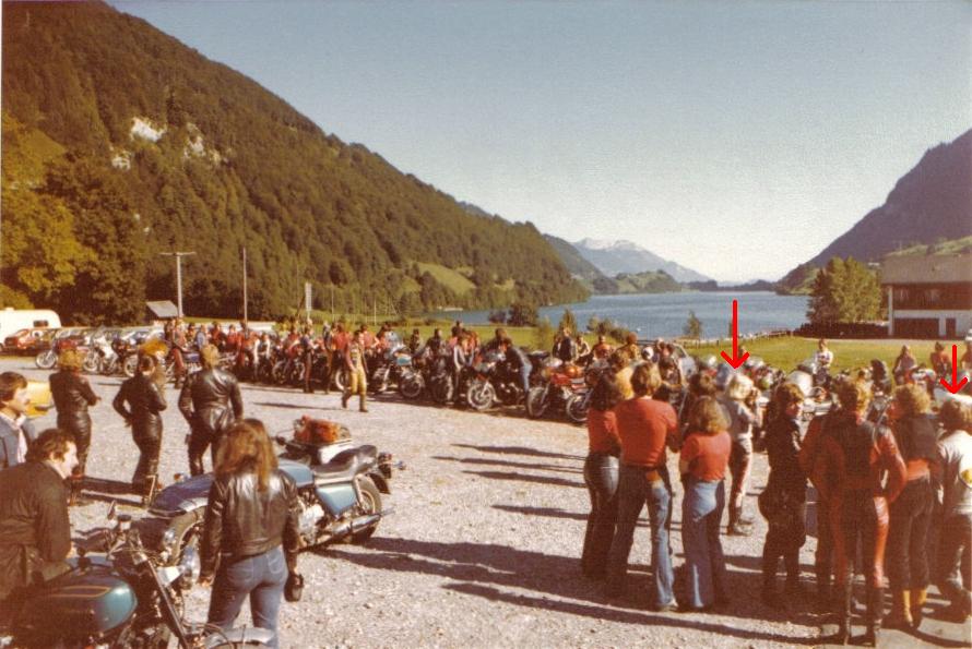 This picture shows the first international GoldWing-gathering in Switzerland, lake of Lungern held in September 1978