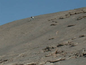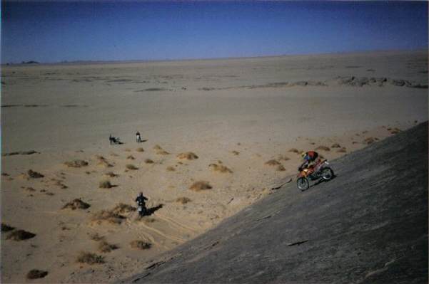 Das Problem des Felsens war, dass er, wie auf dem Bild, wo man das Gefälle etwa einschätzen kann, nicht sanft zum Wüstenboden verlief, sondern in einer praktisch senkrecht stehenden, etwa zwei Meter hohen Böschung. Diese konnte unmöglich im rechten Winkel angefahren werden. Die Herausforderung war gross und da ich diesbezüglich eher zur Kategorie der «Hosenscheisser» gehöre, Philipp - immer noch mit seinem Schlüsselbeinbruch beschäftigt - auch nicht als Vorreiter dienen konnte, lag es allein an mir, dieses Wagnis zu starten. Und da ich dank Dany Wirz, und natürlich vor allem dem besten Gelände-Instruktor Jens Scheffler, gelernt hatte, nie aufzugeben, musste es hier und jetzt unebdingt sein! Ich legte mir meine Strategie fest: Ich musste in grosser Geschwindigkeit in einer Kurve in die Steigung hineinfahren, um den Anpressdruck auf die Räder zu kriegen, um die praktisch senkrechte Böschung zu überwinden, um auf den Felsen zu gelangen! Aber auch dies hatte immer noch nichts mit der «Selbsterfahrung» zu tun...
