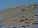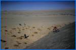 Auf zum Aufmacher-Bild der Reisereportage Diese Stern-Düne erhob sich von weit her sichtbar und zog an wie ein Magnet: Klar, dass sie erobert werden musste! In Ermangelung eines Anhaltpunktes, wo sie aufhört (die Auffahrt ist viel, viel steiler als sie aus dieser Perspektive aussieht), muss mit Sorgfalt die Spitze erklommen werden: Wer mit zuviel Tempo an den Kamm gerät, fliegt ab - und zwar gewaltig. So legte ich den anderen die erste Spur und blieb prompt etwa 30 Meter vor dem Gipfel (Motorrad ohne Fahrer im Hang) stecken. Weniger Mutige erklimmen den Hang zu Fuss, was aber anstrengend ist: 1 Schritt vorwärts bedeutet mindestens einen halben zurück!