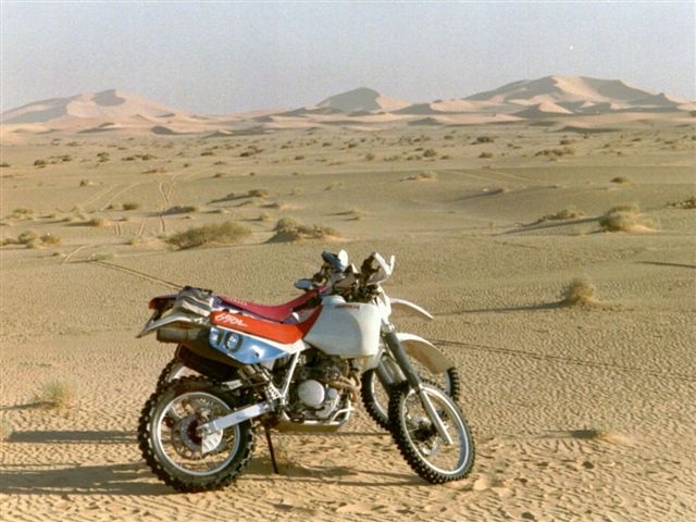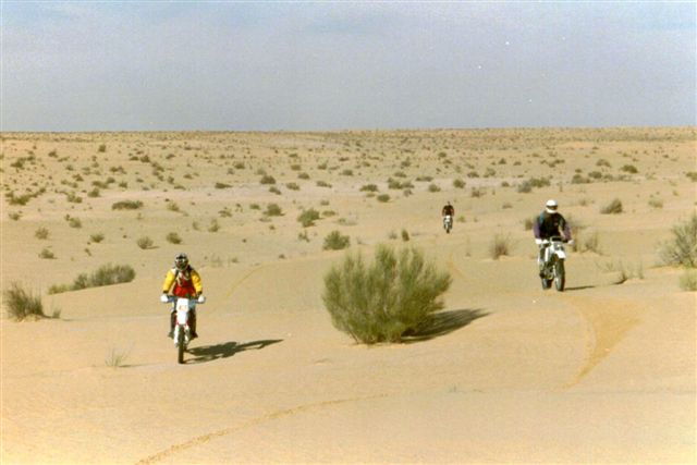 Ganz knapp am Tod vorbei: Das ist das Risiko eines jeden, der sich als Töfffahrer in die Wüste oder als Skifahrer neben die Piste begibt. Von einem auf den anderen Moment ist's mit der Euphorie vorbei, doch ich hatte Glück im Unglück! Es war eine relativ flache (was halt für Enduros so als flach gilt!) Wüste, sandig und mit Sträuchern gespickt: Am Fusse dieser Sträucher gibt es immer ein Häufchen Sand, das vom Wind hin-, aber wegen der Luftstörung durch den Strauch, nicht gleich weitergeblasen wird. Die Häufchen können je nach Strauchgrösse auch zu einem Haufen von einem halben Meter anwachsen. |