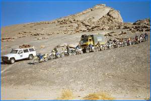 Auf zum Aufmacher-Bild der Reisereportage Diese Stern-Düne erhob sich von weit her sichtbar und zog an wie ein Magnet: Klar, dass sie erobert werden musste! In Ermangelung eines Anhaltpunktes, wo sie aufhört (die Auffahrt ist viel, viel steiler als sie aus dieser Perspektive aussieht), muss mit Sorgfalt die Spitze erklommen werden: Wer mit zuviel Tempo an den Kamm gerät, fliegt ab - und zwar gewaltig. So legte ich den anderen die erste Spur und blieb prompt etwa 30 Meter vor dem Gipfel (Motorrad ohne Fahrer im Hang) stecken. Weniger Mutige erklimmen den Hang zu Fuss, was aber anstrengend ist: 1 Schritt vorwärts bedeutet mindestens einen halben zurück!