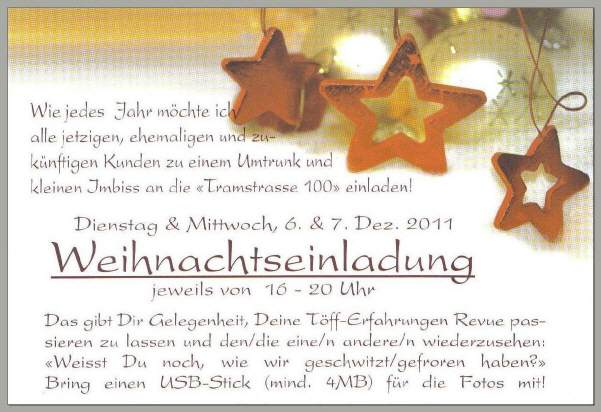 500 Mal versandten wir diese schönen Briefumschläge (ohne die Fotos!) zusammen mit dem kleinsten Adventskalender der Welt und der neuen Schülerzeitung 2012 mit den Kursdaten und vielen Bildern und Text zum «25jährigen Jubiläum»: 1987-2012 25 Jahre «Töff, Töff - nüt als Töff!»