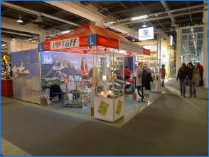 So zeigte sich der Stand für die Ankömmlinge in Halle 3: Hans Richard hat an unserem Stand Werbung gemacht für seine Reisen, wo auch regelmässig meine Kunden dabei sind. Sigrid's Schwester Beate verstärkte das Verkaufsteam am 1. und 2. Ausstellungstag, bevor sie wegen Krankheit die Flügel streichen mussten. Auch Sigrid war anwesend, wer mit ihr kommunizieren wollte, konnte dies dank ihres iPhone 6 tun. Die Truppe, die am Sonntagabend mithalf, abzuräumen: Frank und Karin verstärkten das Team am letzten Ausstellungstag.