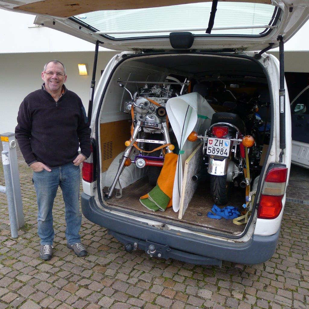 Markus Egli, eines der ersten Mitglieder im GoldWing-Club Schweiz, stellte mir eine seiner Maschinen zur Verfügung: Eine weitere war auf dem Stand in Halle 5, beim GoldWing-Club Schweiz zu sehen. Hier organisierten wir den Transport, aufs Bild «klick»en!