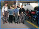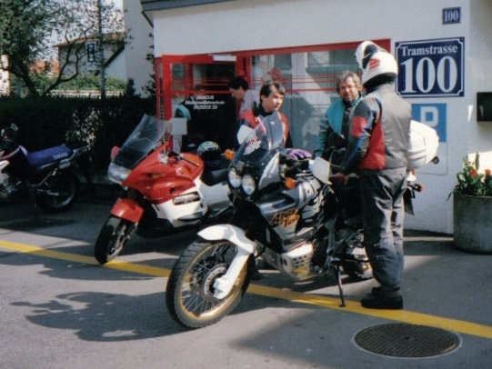 Im Mai 1993 trafen sich die Herren v.l.n.r. Toni Kalberer, Bruno Kneubühler, Bruno Langenegger, Andy Nauli, Urs Tobler und Hanspeter Krieg an der Tramstrasse, um offiziell die Prüfung zum Instruktor des Verkehrssicherheitsrates abzulegen. Sie bestand aus einem schriftlichen und einem mündlichen Teil, sowie einer «Fahrprüfung» auf einer Maschine mit dem Töff-Profi Küre Werren aus Bern auf dem Sozius, dahinter im Schlepptau Hubert Schalbetter auf Küre's Africa Twin. |