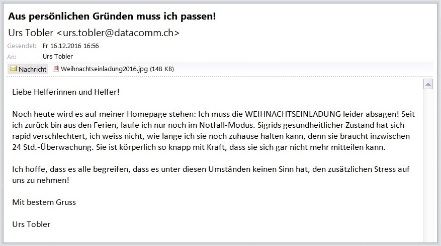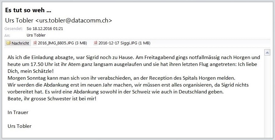 16.12.2016/15:07 Nach der Rückkehr von unseren schönen Ferien auf Teneriffa hat sich der Zustand meiner Lebenspartnerin derart verschlechtert, dass ich seit Tagen nur noch im NOTFALL-MODUS funktioniere. Um mich selbst zu schützen, musste ich aufgrund der momentanen Situation schweren Herzens diesen Entscheid fällen. Ich hoffe, einen ähnlichen Abend im neuen Jahr zu feiern. Sorry, die Lage ist wirklich ernst. Hier geht's zum Mail 18.12.2016/01:21 Dramatische unerwartete Wendung: Goodbye Sigrid wurde am späten Freitagabend in den Spital Horgeneingeliefert, wo sie am frühen Samstagabend für immer die Augen schloss ...Hier geht's zumMail