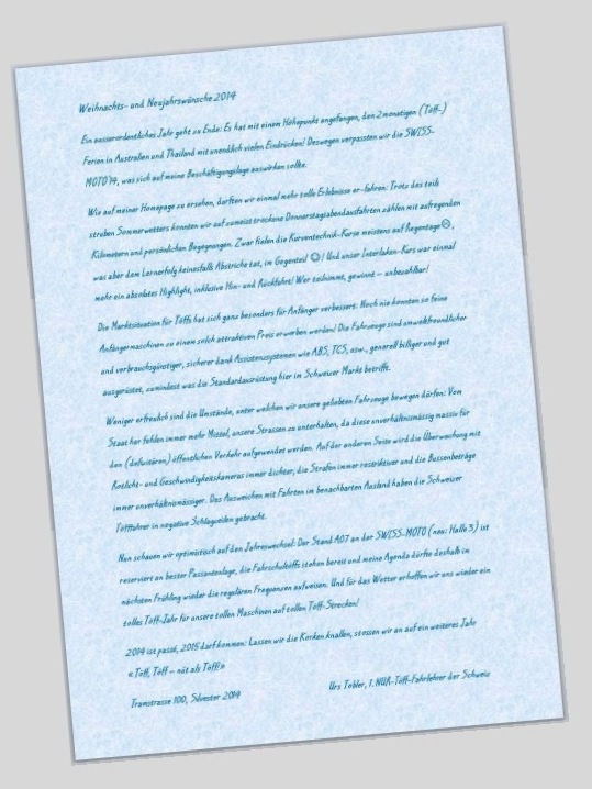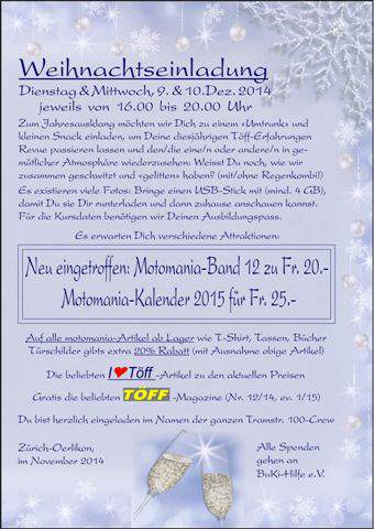 This year I will not attend to the SWISS-MOTO'2014-exposition, because my girl-friend Sigrid an I will be on a hough tour "Far East". We will be back the end of February - for my customers there is still the possibility to receive a vaucher to get a free ticket (it was sent out by Christmas) and for Fr. 12.- each you can order with Milly!